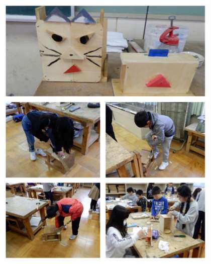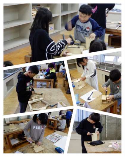 1月27日(月)、4年生は図画工作科「ギコギコ クリエーター」で、廃材を切ったり、釘を打ったりして思い思いの作品を作り上げていました。