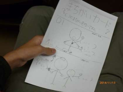 はじめに出てくる児童の姿が、次に出てくる時には少し変化しています。その違いを「まちがいカード」に記入します。さて、いくつ見つけられたことでしょう。