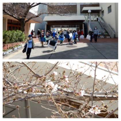 正門の桜が開花する中、たくさんの荷物を持ちながら元気に下校していきました。