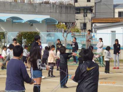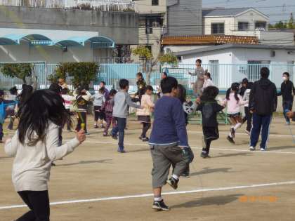 今日の20分休みに、全校児童が縄跳びの練習をしました。矢田北体操(柔軟性を高める学校独自の体操)の後、音楽に合わせ、みんなで縄跳びをしました。