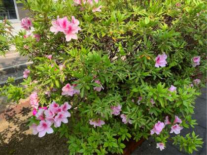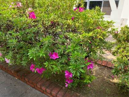 みなさんが静かに家で過ごしている間に季節は進み、学校のプールの更衣室前には、赤とピンクのきれいな花が咲いています。