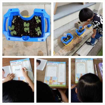 それから、この前植えたアサガオの種から、早くもふた葉が出てきました。早く大きくなあれと思いを込めて水やりをしました。また、保健室で身長と体重も測ってもらいました。