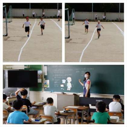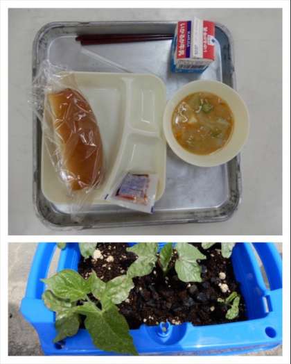 写真下は、今日の給食で献立は「牛乳、コッペパン、みそ汁」、1年生が育てているアサガオは、すくすくと育っています。