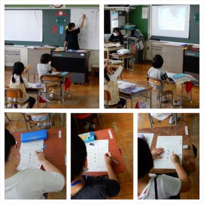 写真中は、1年国語でひらがな「く」、算数で数字「1・2・3・4・5」の勉強