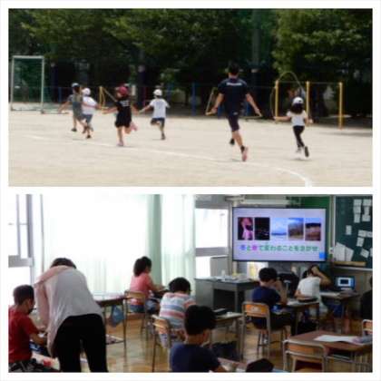 3年生の休けい時間の様子です。担任と一緒に運動場を縄跳びで競走をしていました。