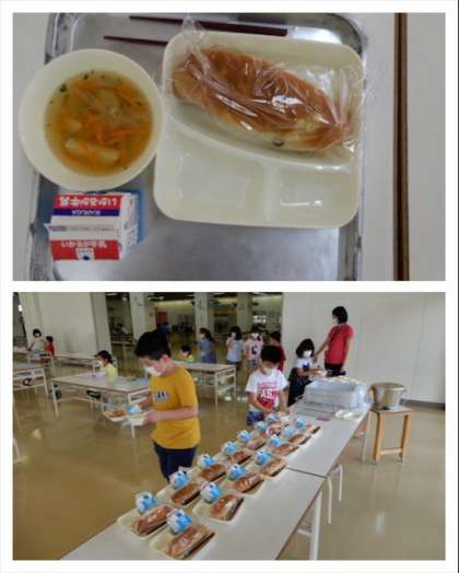 本日の給食の献立は、「スープ、牛乳、おさつパン」です。