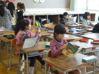 運動場が使えません。お昼の休み時間の子どもの様子の一部です。粘土遊び・お絵かき・読書をしているところです。