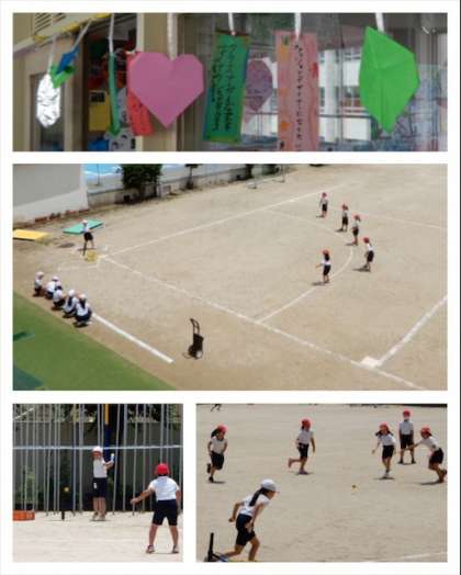 3年生は、もうすぐ七夕なので短冊に願い事を書いて廊下に飾っています。また、体育では、ティボールのゲームをしました。