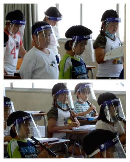 3年生は、音楽でフェースシールドをして歌唱やリコーダーの練習をしました。