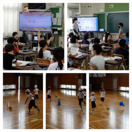 1年生は、体育科でまとに見立てたコーンをねらってボールを投げていました。見事命中すると、グループで喜んでいました。