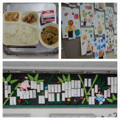下は、今月の玄関掲示です。今月は、5年生の作品で七夕にちなんで、笹の葉にクラス全員が願い事を書いて飾っています。