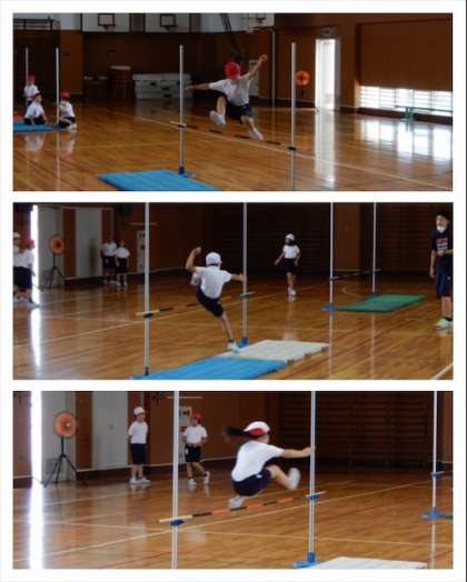 3年生は、体育で走り高跳びの学習をしていました。みんなリズムよく上手に跳べていました。