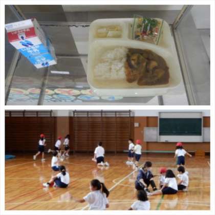 今日の給食の献立は、「ご飯、牛乳、夏野菜のカレーライス、キャベツのサラダ、豆こぶ」でした。