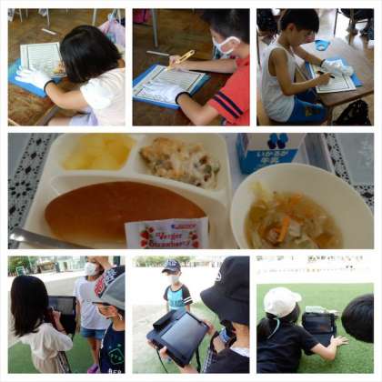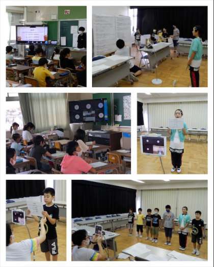 まずは、児童集会の様子です。リモート放送で3択クイズを出題しました。担当の放送・集会委員会の人たちは、カメラを前に緊張しながらも、はきはきと進行できました。