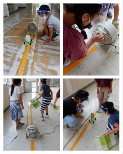 3年は、理科の実験でサーキュレーターを使って風力の強さによって車の動く距離の違いを調べていました。