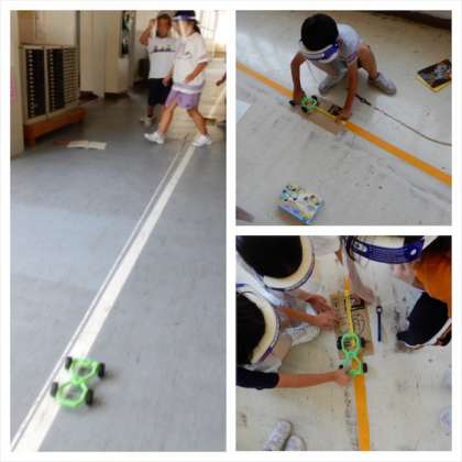 3年は理科の学習で、前回の風力に続いて今回はゴムの力で車を動かす実験をしていました。