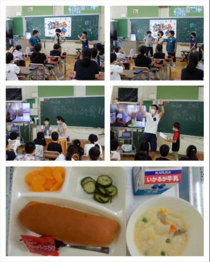 最後に今日の給食の献立です。「コッペパン、牛乳、コーンクリームシチュー、キュウリのバジル風味サラダ、みかん(缶)、いちごジャム」でした。