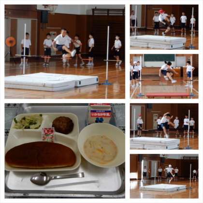 体育科の学習で、1年はコースの間に置いている円盤をひっくり返しながら、競走していました。5年は、走り高跳びをしていました。バーを怖がらずに、リズムよく跳べていました。