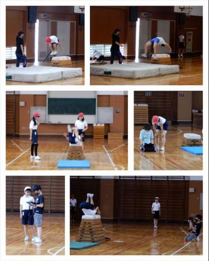 6年は、体育科の跳び箱運動の学習で、自分が挑戦したい技を何度も練習していました。また、タブレット端末で跳んでいる様子をビデオに撮って、どこに気をつければいいかをチェックしたり、教え合ったりしていました。
