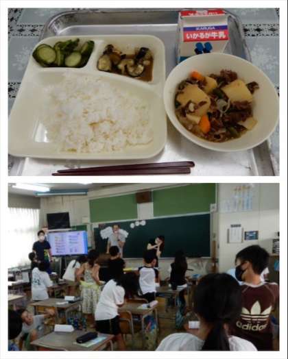 今日の給食の献立は、「ごはん、牛乳、肉じゃが、焼きなすのみそだれかけ、あっさりきゅうり」でした。