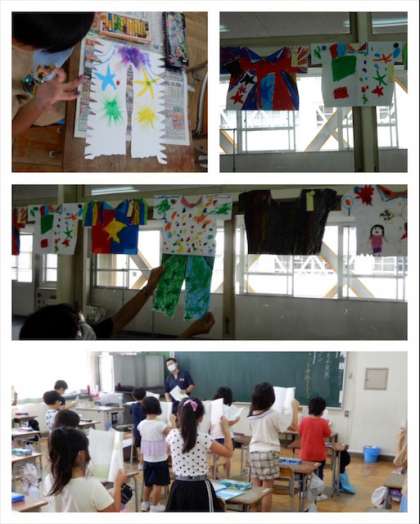 1年は、図画工作科でパスを使って自分だけのシャツとズボンをデザインしました。
