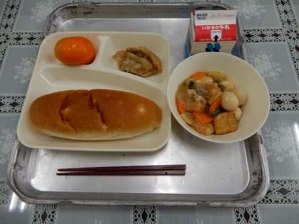 今日の給食の献立は、「おさつパン、牛乳、揚げぎょうざ、中華煮、冷凍みかん」でした。