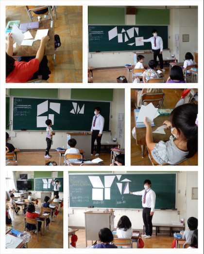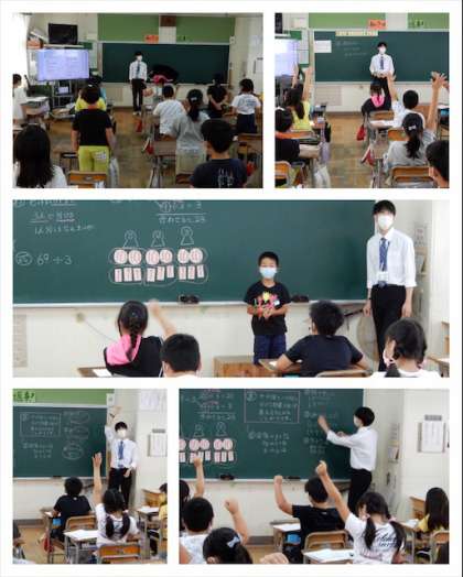 いずれも算数科の授業で、1年では「くり上がりのあるたし算」2年では「三角形と四角形」、3年生では「わり算」の学習をしました。