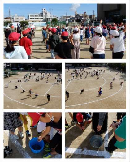 今日は、久しぶりに運動場で全校朝会を行いました。その後に、体育大会に向けて全校で運動場の石拾いをしました。