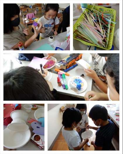 2年は、生活科の学習で紙皿や紙コップなどを使っておもちゃ作りをしていました。