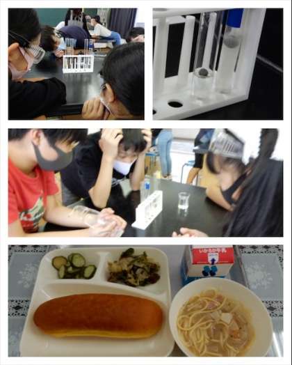 6年は、理科の学習で塩酸を使って金属を溶かす実験をしていました。危険な薬品を使うので、先生の説明をよく聴いて慎重に実験していました。