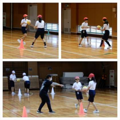 6年は、体育大会で行う団体競技の練習を行いました。騎馬戦が3密を避けられないため、二人一組になってボール運びをします。