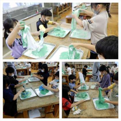 3年は、11月の工作展に向けて作品づくりに取り組んでいます。写真は、液体絵の具にタオルを浸しているところです。さて、どんな作品に仕上がるのでしょうか。
