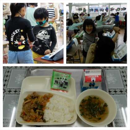 今日の給食の献立は、「ごはん、牛乳、ピリ辛丼、中華スープ、ソフト黒豆」でした。