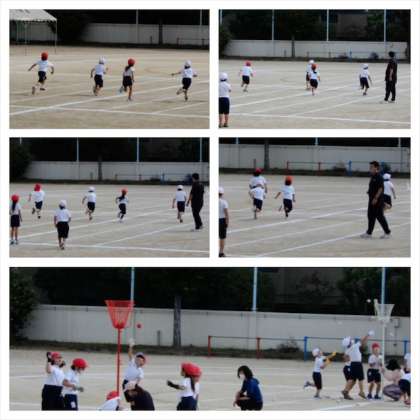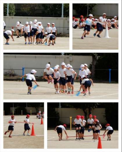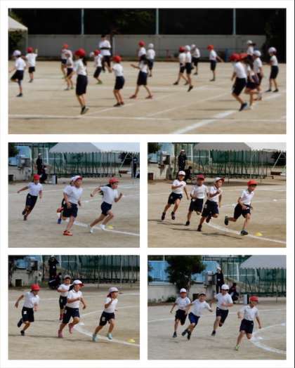 写真上は、1年生のかけっこと玉入れの様子です。みんな直線コースをちゃんと真っ直ぐ全速で走れました。玉入れでは、競技の合間に腰をふって楽しくダンスもしています。