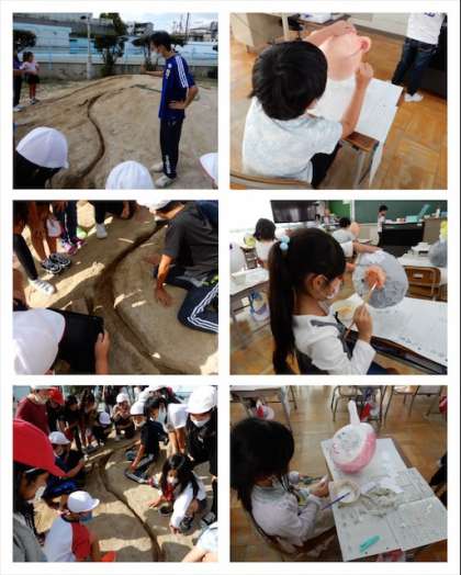 5年生は、理科の「川のはたらき」の学習で、実際に砂山に溝を掘り、そこに水を流して川がどのように地形を変えていくのかを観察しました。