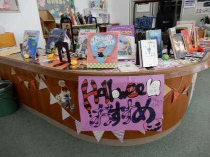 毎週火曜日は、学校図書館補助員さんが常駐してくれています。今月は、ハロウィンのシーズンなので魔法使いなどにまつわる本をカウンターに展示しています。