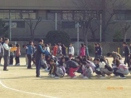 今日は、地震と津波を想定した避難訓練を行いました。運動場に避難した後、体育館に避難しました。