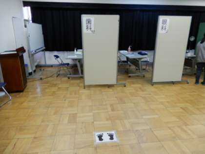 写真3・・・健康診断は、会議室の各ブースに間隔をとってお並びください。