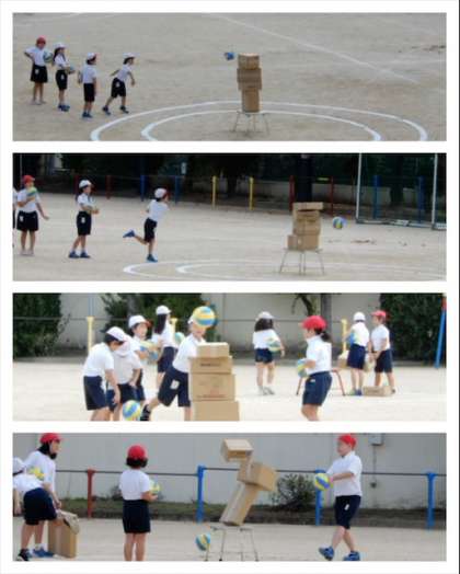 2年は、体育科の学習でポートボール台の上に乗せた段ボール箱を当てて落とす的あてゲームをしていました。