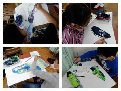 4年は、図画工作科の学習で、靴をよく見て絵画に表していました。色の変化を水加減を少しずつ変えながら上手に色をつけていました。