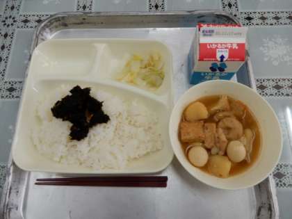 今日の給食の献立は、「ごはん、牛乳、関東煮、白菜の甘酢和え、海苔の佃煮」でした。