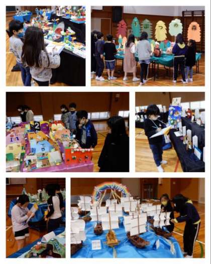 今日から児童の工作展の鑑賞が始まり、初日は5年生と3年生が鑑賞しました。鑑賞しながら他学年の作品のがんばっているところなどをメモしていました。