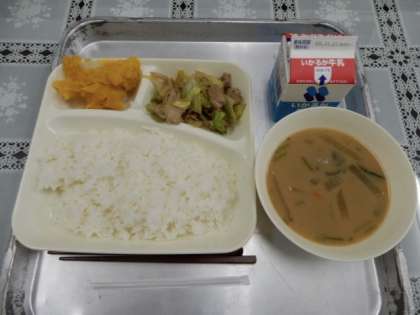 今日の給食の献立は、「ごはん、牛乳、豚肉とまいたけの炒め物、つみれ汁、かぼちゃういろう」でした。