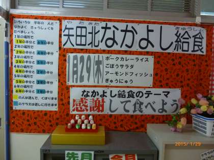 交流給食の様子です。いつもとは違って、他の学年の友達と一緒に給食をいただきました。(カレーライス)ハートの形をしたニンジンの入っていた児童には、給食調理員さんから、メッセージカードが贈られました。