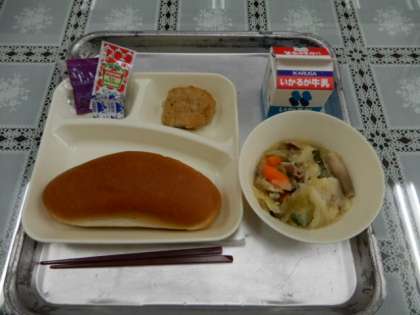 今日の給食の献立は、「コッペパン、牛乳、豆腐ハンバーグ、カリフラワーのスープ煮、固形チーズ、ブルーベリージャム」でした。