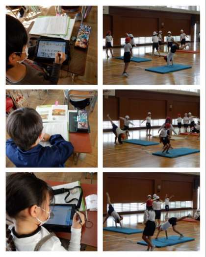 3年は、国語科の学習の発展で世界の家のつくりについてタブレット端末でまとめています。また、体育科ではマット運動で側方倒立回転などの技の練習をしていました。