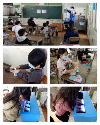 手洗いチェッカーを手に塗ってブラックライトに当てて一面、白くなっていることを確かめます。その後に手洗いをして、もう一度ブラックライトに当てて洗い残しの箇所を確認しました。