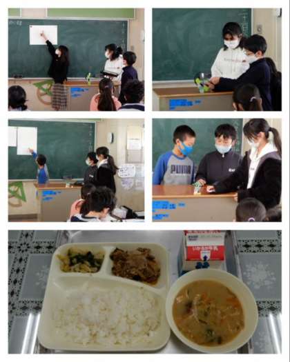 今日の給食の献立は、「ごはん、牛乳、豚肉のしょうが焼き、さつまいものみそ汁、きくなと白菜のごま和え」でした。