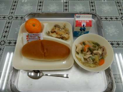 今日の給食の献立は、「コッペパン、牛乳、鶏肉とじゃがいものスープ煮、きのこのドリア、みかん、いちごジャム」でした。
