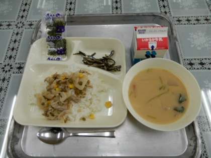 今日の給食は、お正月献立の「ごはん、牛乳、レンコンのちらし寿司、ぞう煮、ごまめ」でした